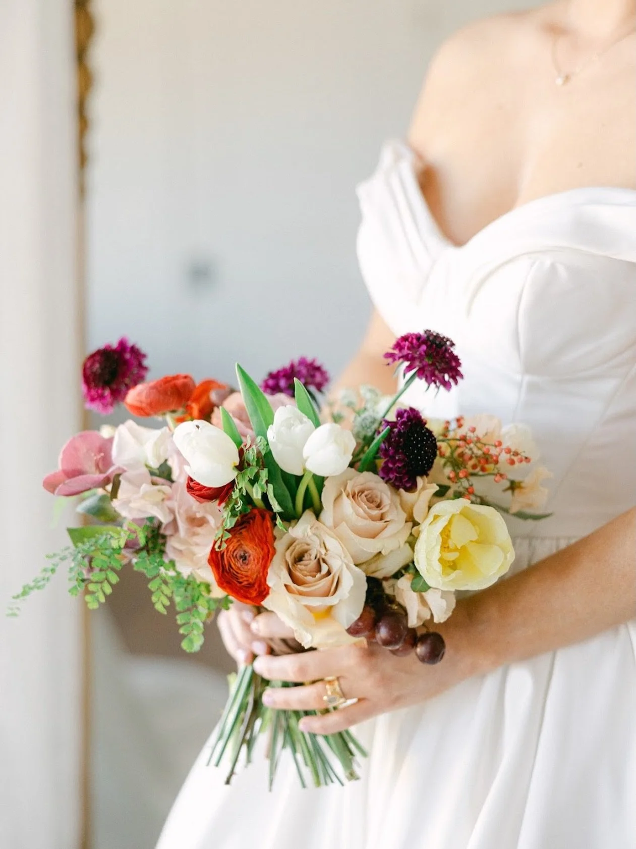 Behind the scenes, Jenny manages many of the important production elements that keep our studio running smoothly. She carefully monitors the flowers that arrive from our wholesalers, inspecting each stem for quality and freshness while tracking pricing and inventory. Her organization and attention to detail help ensure that every design we create meets the high standards we promise our couples.