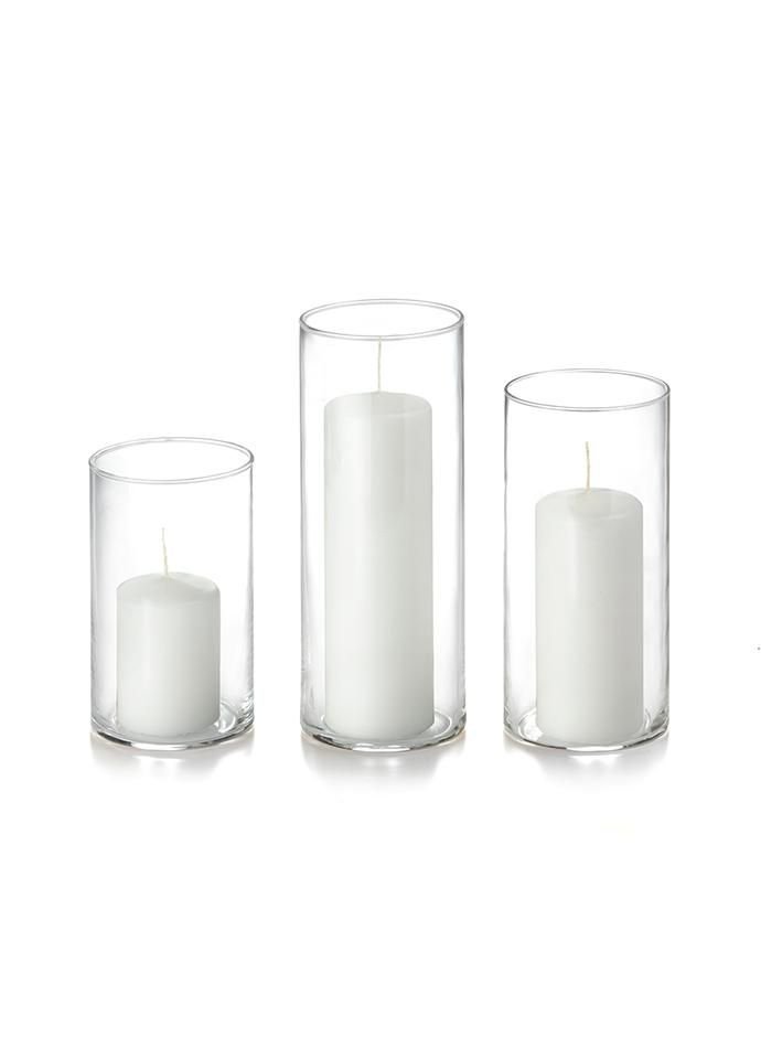 Includes cylinder and pillar candles in white. Burn time is over 20 hours